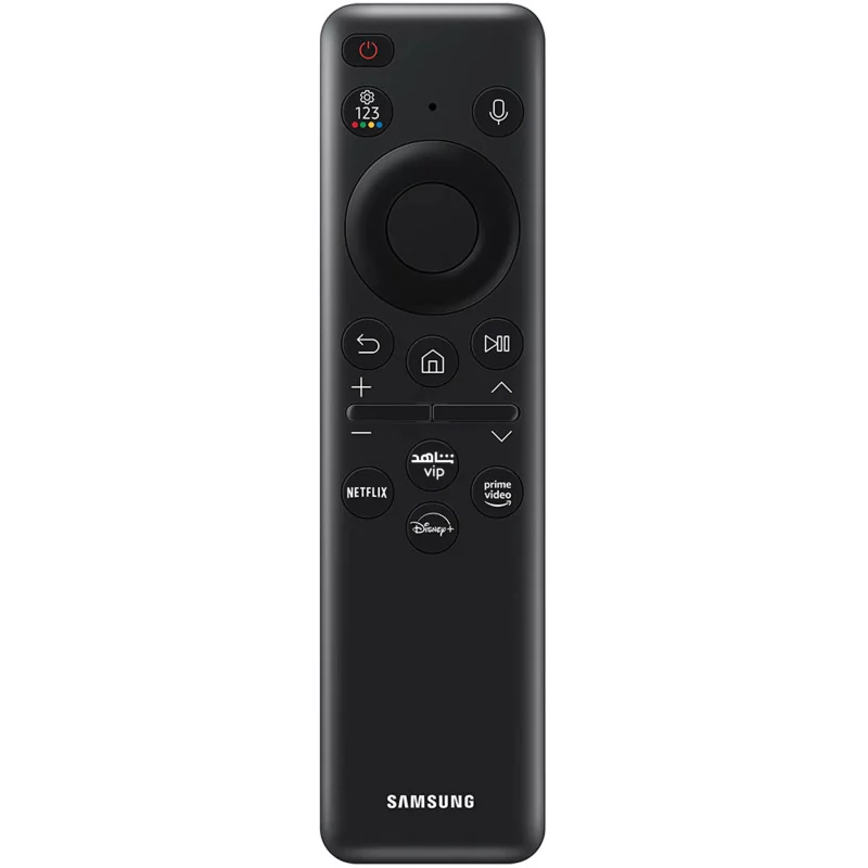 ریموت کنترل هوشمند سامسونگ، طراحی مینیمال و ارگونومیکی دارد. این ریموت با باتریهای خورشیدی کار میکند که میتوانند با نور محیط یا از طریق USB-C شارژ شوند، که گامی بزرگ در جهت پایداری محیط زیست است. این ریموت میتواند اکثر دستگاههای متصل به تلویزیون را نیز کنترل کند.