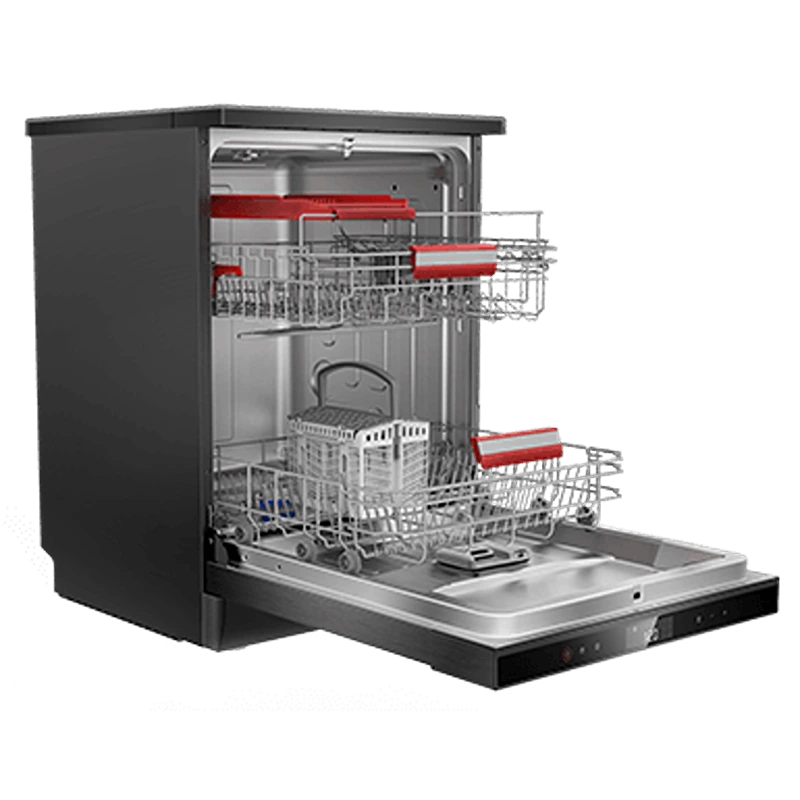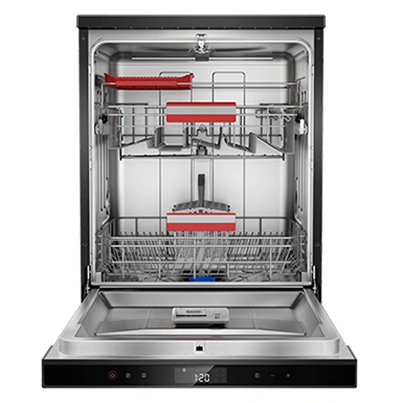 ابعاد این ظرفشویی به صورت عرض 598، ارتفاع 845 و عمق 600 سانتیمتر طراحی شده و وزن آن هم 51 کیلوگرم است. این ابعاد استاندارد باعث میشود بدون هیچ دردسری داخل کابینتها جا بگیرد. همچنین ظرفشویی DW-14F2ME-BS اصلی، هم به صورت توکار (داخل کابینت) و هم روکار (جداگانه روی زمین) قابل نصب است که بسته به نیازتان میتوانید انتخاب کنید. در قسمت پایینی دستگاه، پایههای مشکی رنگ قرار گرفتهاند که علاوه بر حفظ تعادل، قابلیت تنظیم ارتفاع هم دارند. این موضوع باعث میشود بتوانید ظرفشویی را دقیقاً با ارتفاع کابینت یا سطح آشپزخانه هماهنگ کنید. پنل پشتی آن هم با طراحی یکپارچه و پوشش ضد زنگ ساخته شده و دوام بالایی دارد. پشت دستگاه هم به صورت یکدست و ساده طراحی شده و به لطف پوشش ضد زنگش، دوام بالایی دارد.
