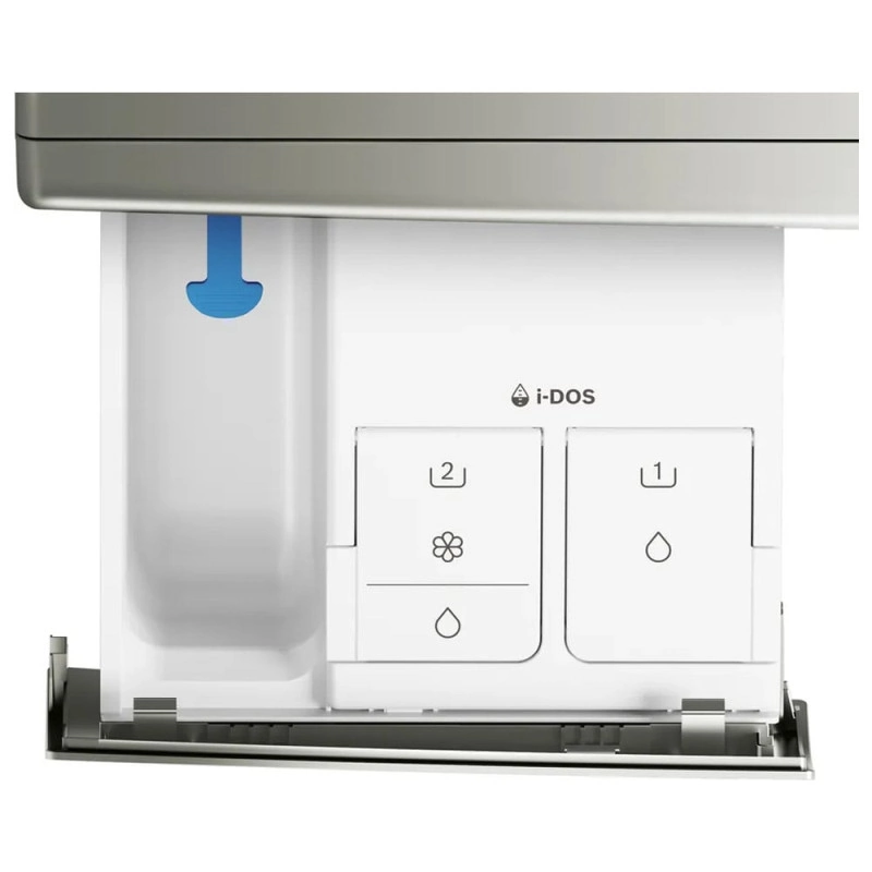 یکی از برجستهترین و کارآمدترین ویژگیهای این مدل، سیستم هوشمند تزریق خودکار مایع شوینده و نرمکننده یا i-DOS (Intelligent Dosing System) است. این سیستم یک بار برای همیشه به دغدغه “چه مقدار شوینده بریزم؟” پایان میدهد. شما کافی است یک بار مخازن تعبیه شده در جاپودری را با مایع لباسشویی (تا 1.3 لیتر) و نرمکننده (تا 0.5 لیتر) پر کنید. از این پس، دستگاه برای هر چرخه شستشو، به طور خودکار و با دقت میلیلیتر، مقدار دقیق شوینده مورد نیاز را تزریق میکند.