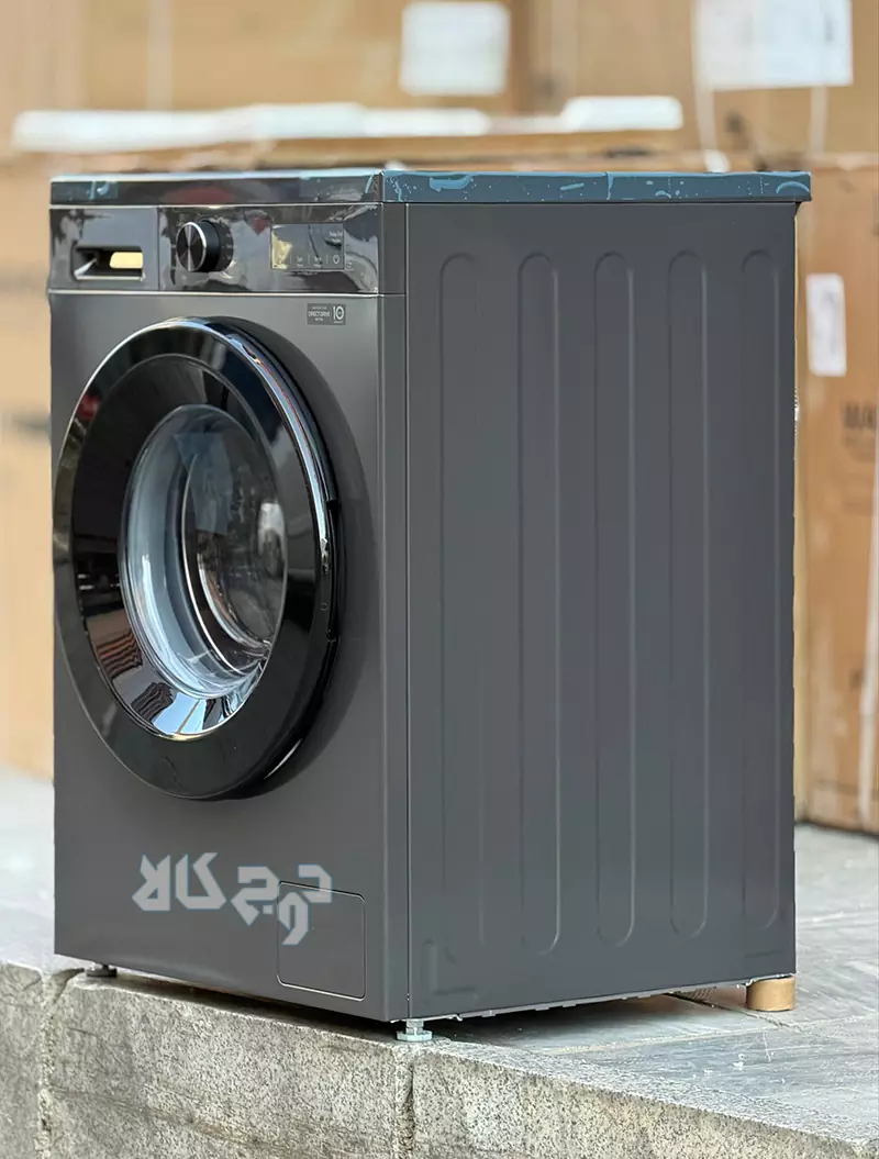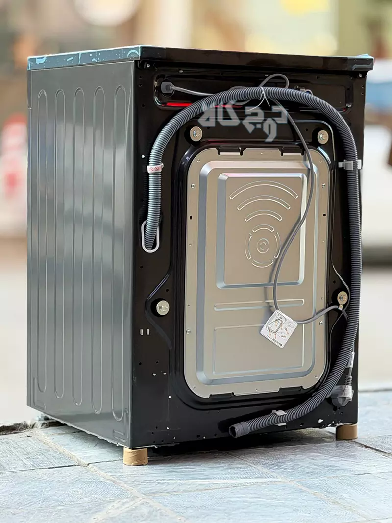 - رنگ دودی و بدنهی مستحکم: رنگ دودی (Smoky Gray) بدنه، ظاهری شیک و منحصر به فرد به دستگاه میبخشد که به راحتی با طیف وسیعی از رنگها در آشپزخانه یا فضای لاندری ست میشود. بدنه فلزی با پوشش ضد زنگ و مقاوم در برابر خط و خش، تضمینکننده دوام و زیبایی دستگاه برای سالهای طولانی است.
