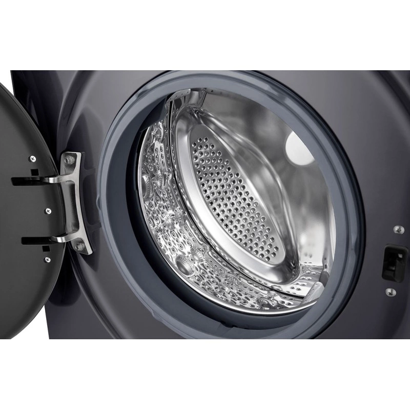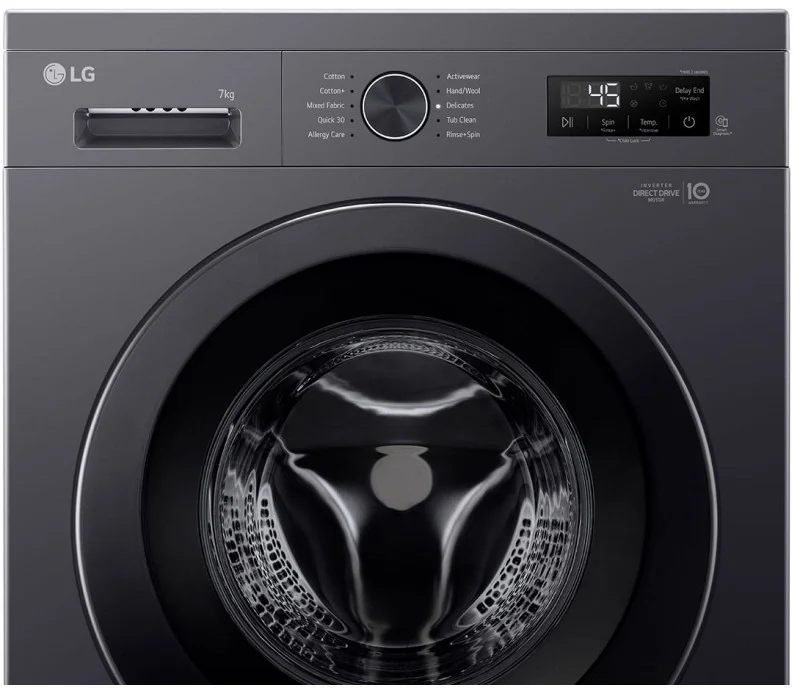 - پنل کنترل LED با کاربری آسان: ال جی در این مدل از یک پنل کنترل دیجیتال با نمایشگر LED واضح استفاده کرده است. تمامی اطلاعات ضروری مانند برنامه انتخابی، دمای آب، سرعت چرخش خشککن و زمان باقیمانده به سادگی قابل مشاهده است. یک ولوم چرخان در مرکز پنل، انتخاب سریع و آسان برنامههای اصلی شستشو را امکانپذیر میکند. این طراحی ساده و کاربرپسند، کار با دستگاه را برای تمام اعضای خانواده آسان میسازد.